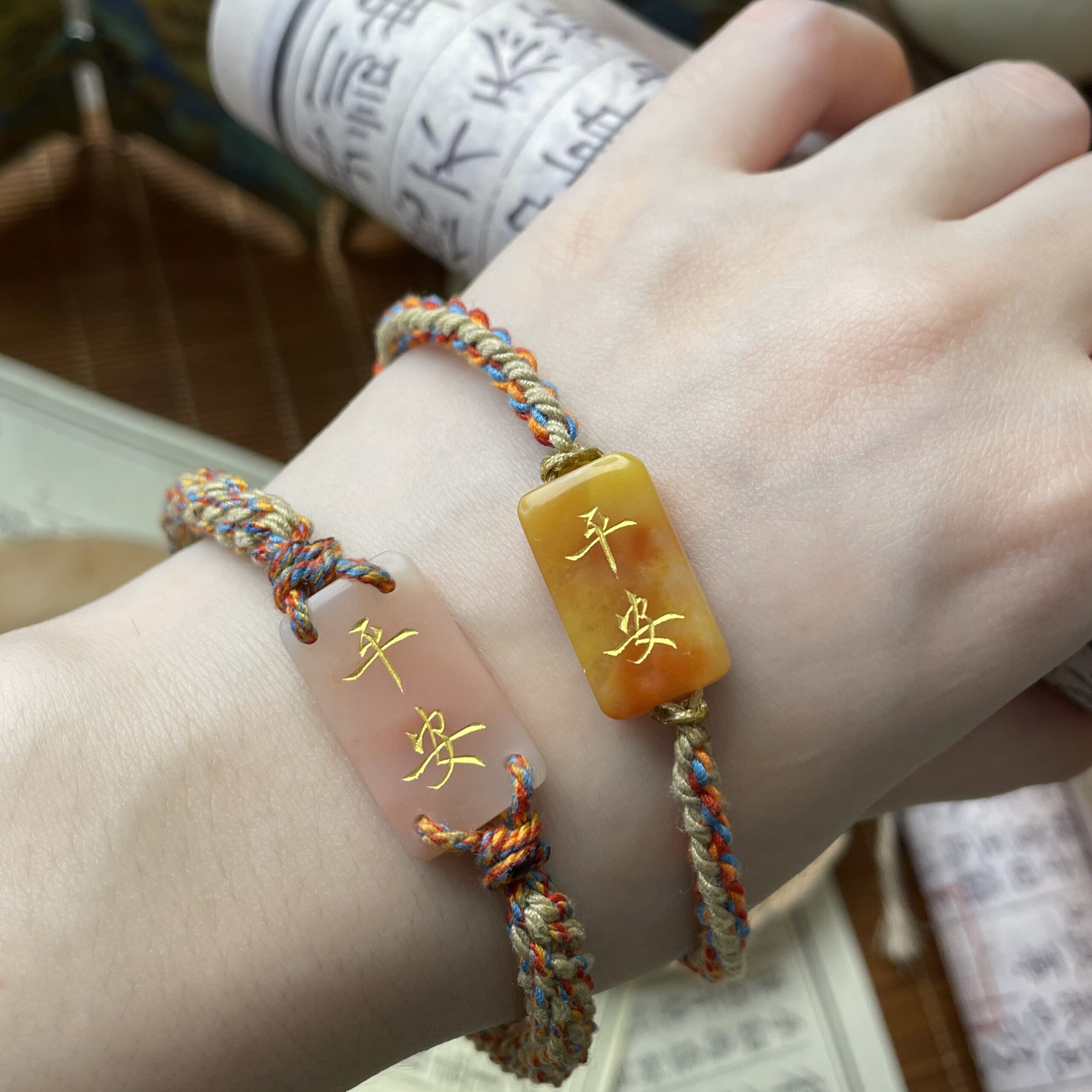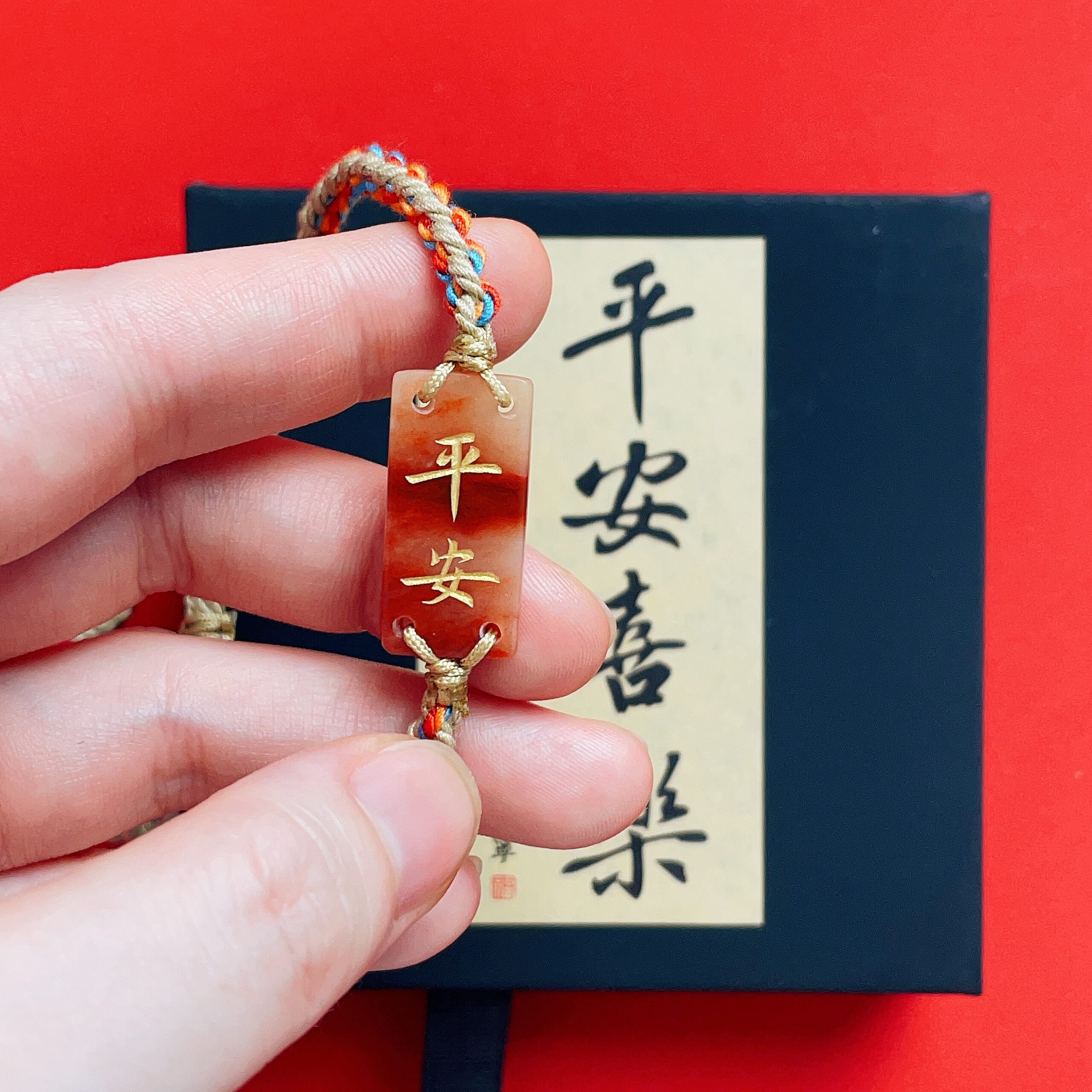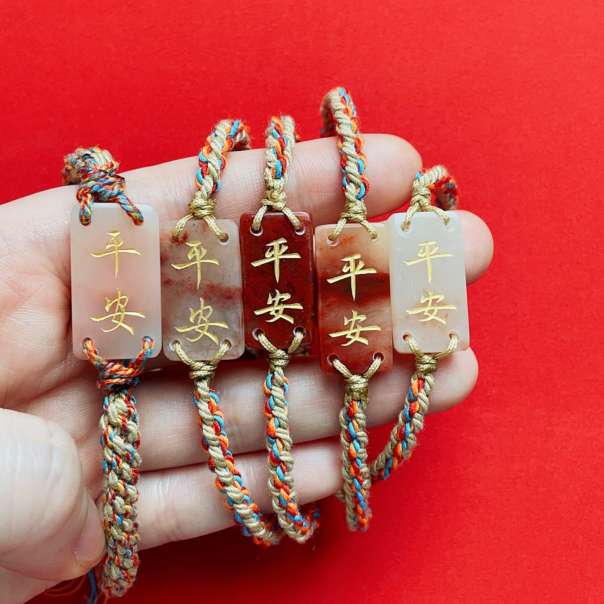 Adorned with gilded Chinese characters “Ping An” (Health & Physical Safety) on its surface, the charm is strung on a hand-woven multicolored cord that is strong, durable and comfortably fits the wrist.
